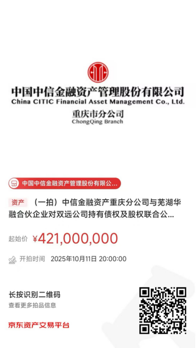 中國中信金融資產(chǎn)管理股份有限公司重慶市分公司(簡稱:中信金融資產(chǎn)重慶分公司)與蕪湖華融資本創(chuàng)榮投資中心(有限合伙)(簡稱:蕪湖華融合伙企業(yè))對重慶雙遠實業(yè)(集團)有限公司(簡稱:雙遠公司)持有債權(quán)及股權(quán),將于2025年10月11日20時至2025年10月12日20時在京東拍賣網(wǎng)通過公開競價方式進行處置,拍賣鏈接如下圖所示,現(xiàn)予以公告。