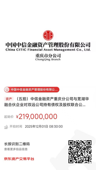 中國中信金融資產(chǎn)管理股份有限公司重慶市分公司(簡稱:中信金融資產(chǎn)重慶分公司)與蕪湖華融資本創(chuàng)榮投資中心(有限合伙)(簡稱:蕪湖華融合伙企業(yè))對重慶雙遠(yuǎn)實業(yè)(集團(tuán))有限公司(簡稱:雙遠(yuǎn)公司)持有債權(quán)及股權(quán),將于2025年12月1日08時30分至2025年12月1日17時30分在京東拍賣網(wǎng)通過公開競價方式進(jìn)行處置,拍賣鏈接如下圖所示,現(xiàn)予以公告。