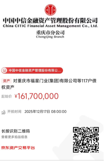 中國(guó)中信金融資產(chǎn)管理股份有限公司重慶市分公司(以下簡(jiǎn)稱我分公司)擁有對(duì)重慶市福星門業(yè)(集團(tuán))有限公司等117戶不良債權(quán)資產(chǎn)。我分公司將于2025年12月17日8:00至2025年12月17日18:00止在京東拍賣網(wǎng)通過(guò)公開競(jìng)價(jià)方式進(jìn)行處置,拍賣鏈接如下圖所示,現(xiàn)予以公告。