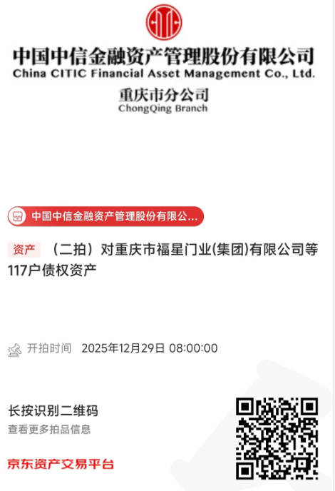 中國中信金融資產(chǎn)管理股份有限公司重慶市分公司(以下簡稱我分公司)擁有對重慶市福星門業(yè)(集團)有限公司等117戶不良債權(quán)資產(chǎn)。我分公司于2025年12月29日8:00至2025年12月30日17:30在京東拍賣網(wǎng)通過公開競價方式進行處置,拍賣鏈接如下圖所示,現(xiàn)再次予以公告。
